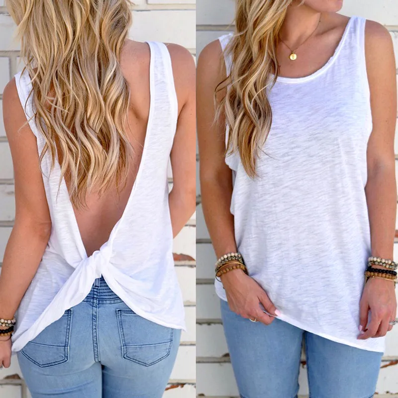 Features: Sleeveless and backless, Baggy in front, twist knot decor, comfy and breezy, Casual Sport Shirt