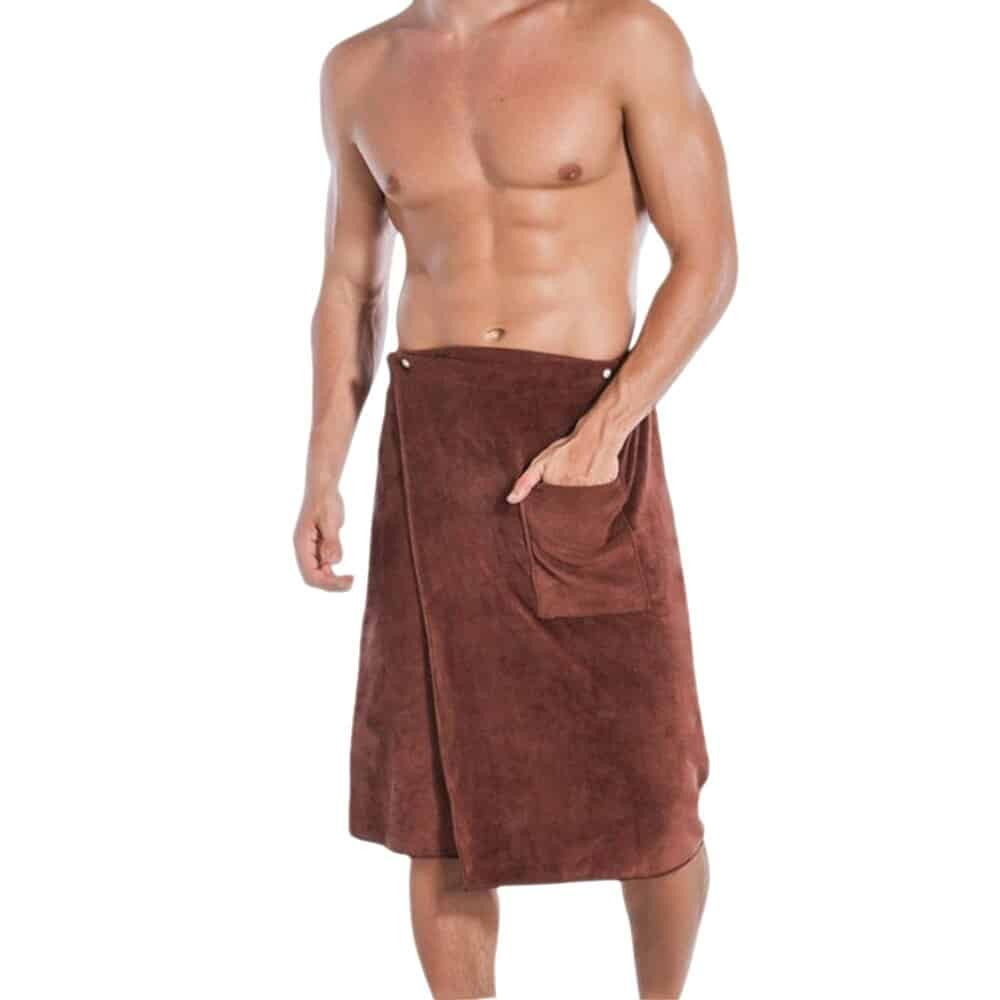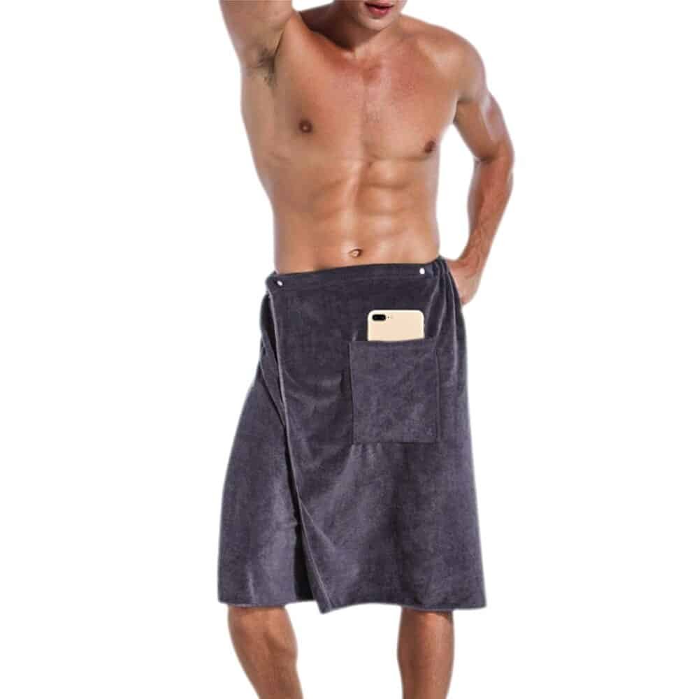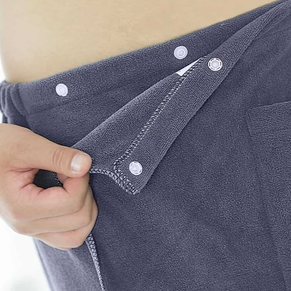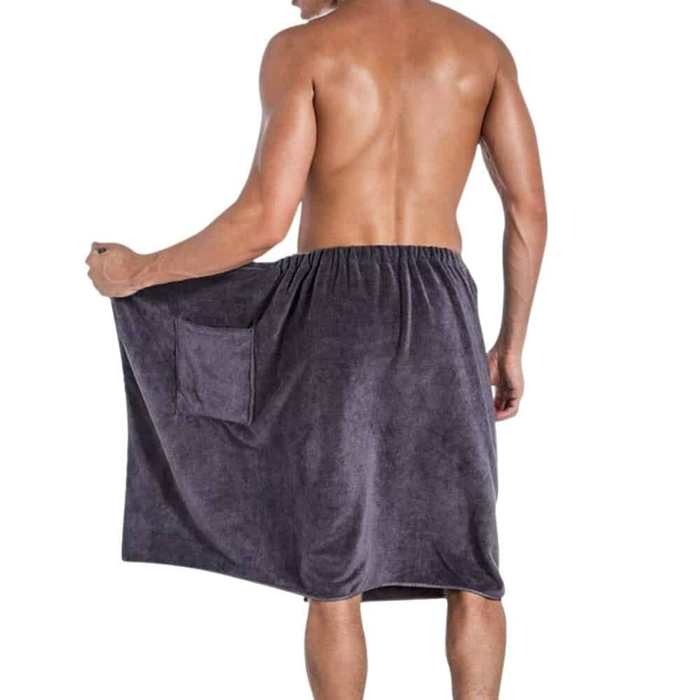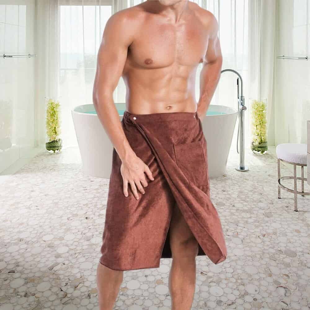 Shower and bath wrap for men, designed for comfort and absorbency. It is double stitched for durability.