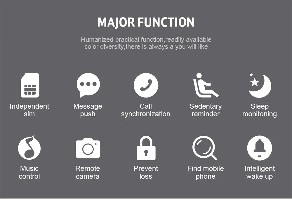 – Pedometer, Step motion meter, Calories calculation, Sports mileage records, Sedentary remind, Sleep monitoring, Remote photos, Alarm clock, Calendar, Notification remind, Time synchronization
