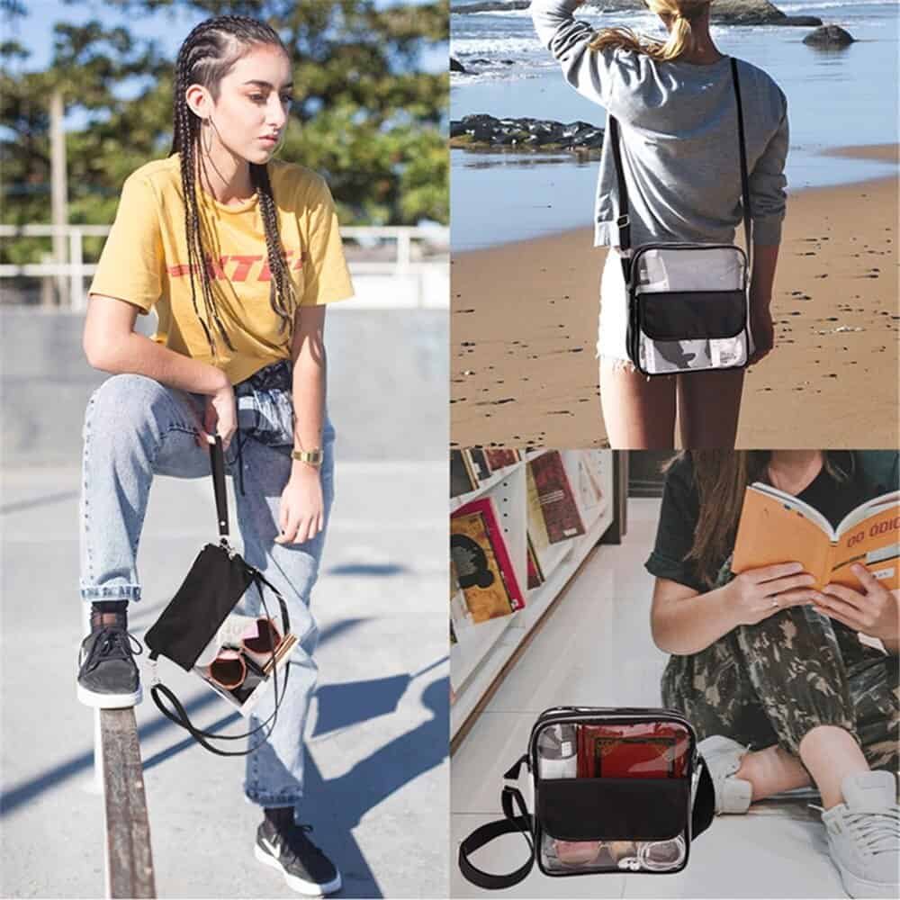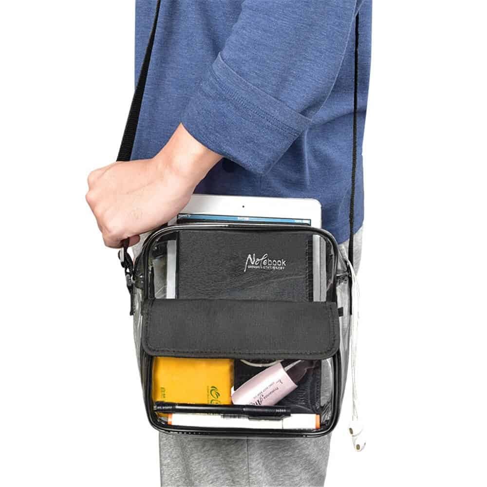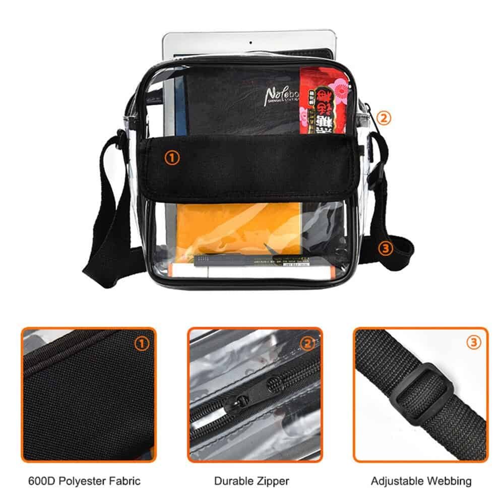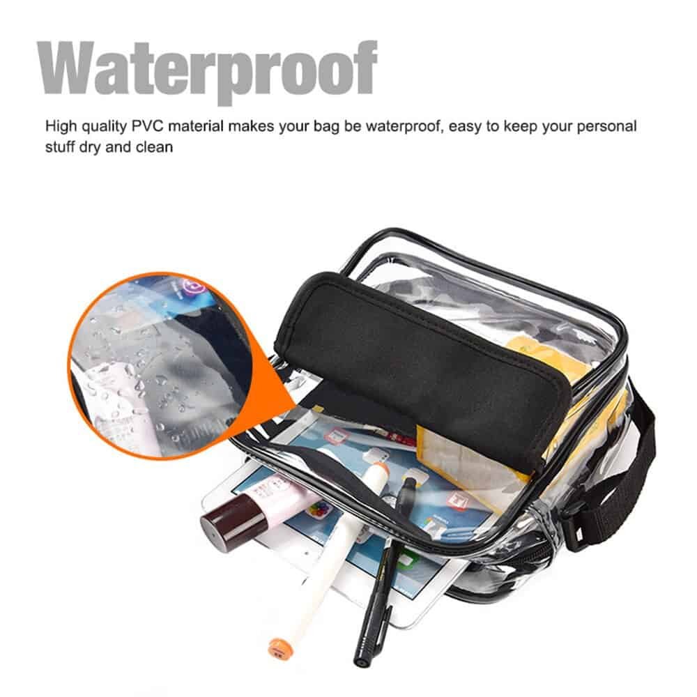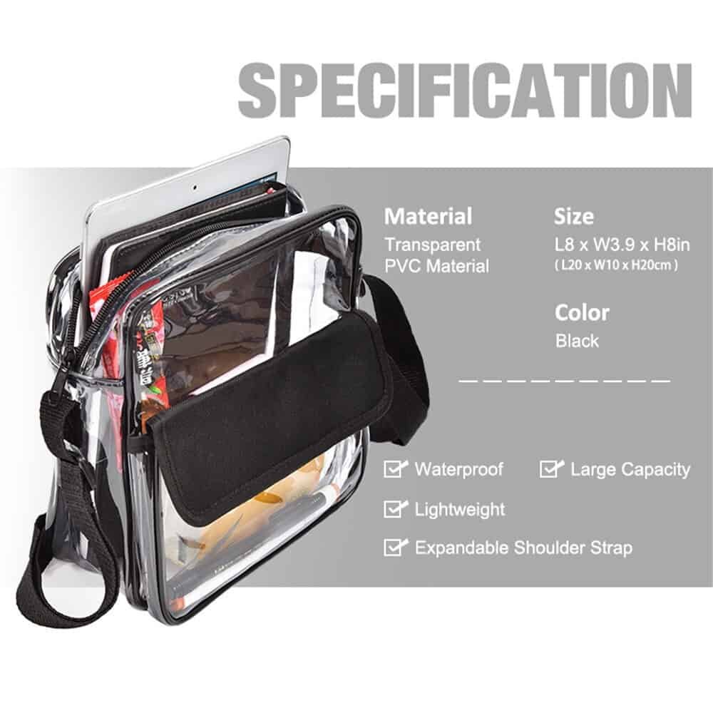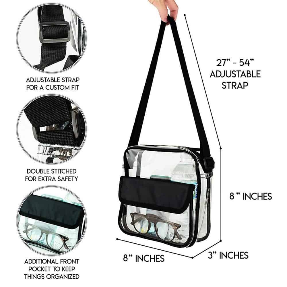 Features: Adjustable Clear Cross-body Bag: Adjusts from a 32″ shoulder strap to 9″ double handle. Dual Pocket Fashion Design: Clear bag with zipper pocket and a smaller flap pocket in front. Waterproof: This bag will resist a light shower so your belongings can remain dry. Versatile: Not just a clear tote bag used on game-day. Suitable for work, airport security, etc.