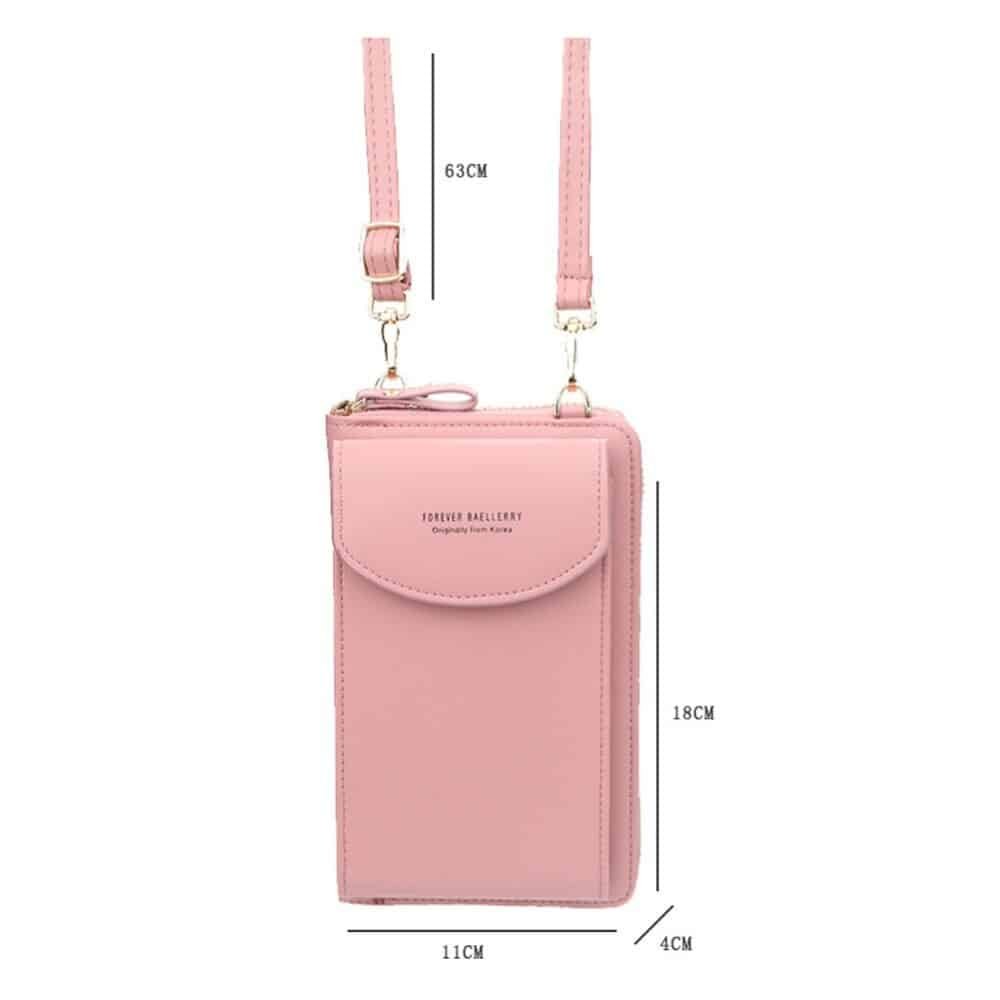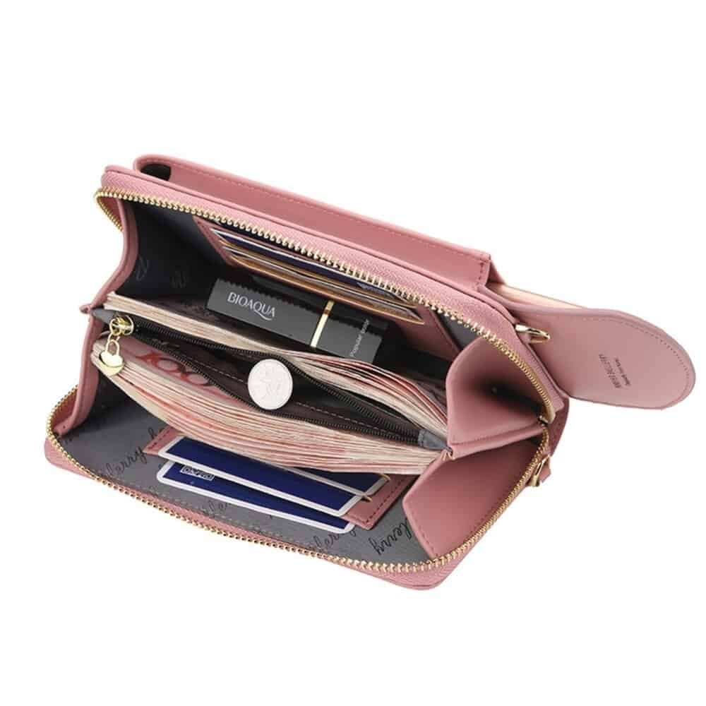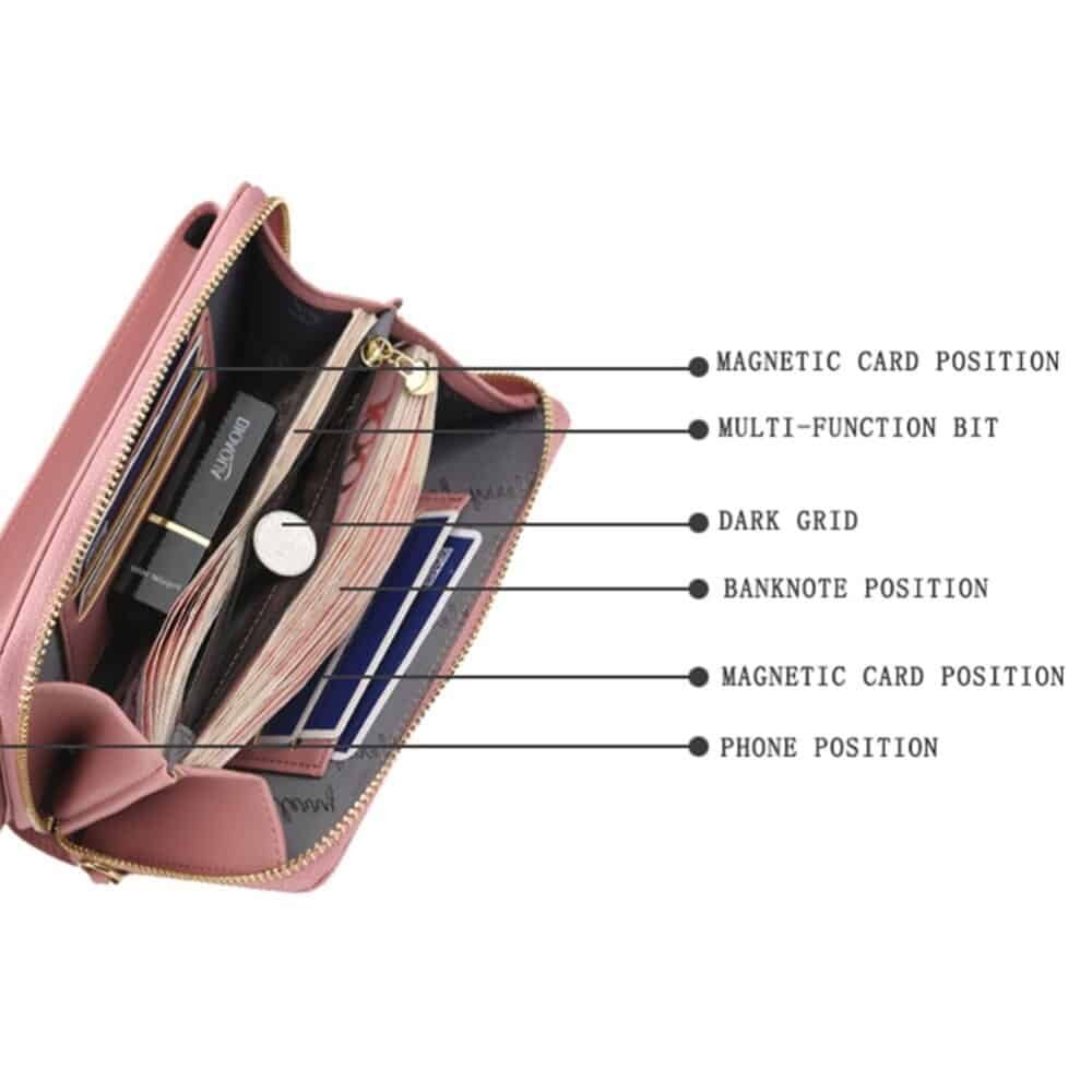 It has room for your cardscash, glasses, keys, passport and much more. It also has an external pocket with a convenient push-button, to safely store your mobile phone.