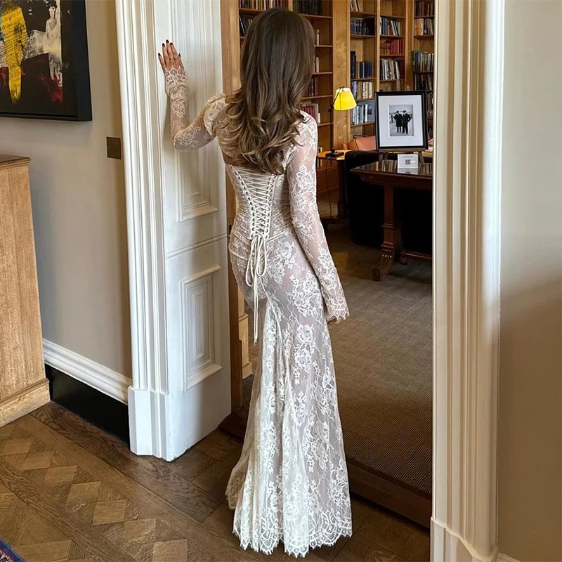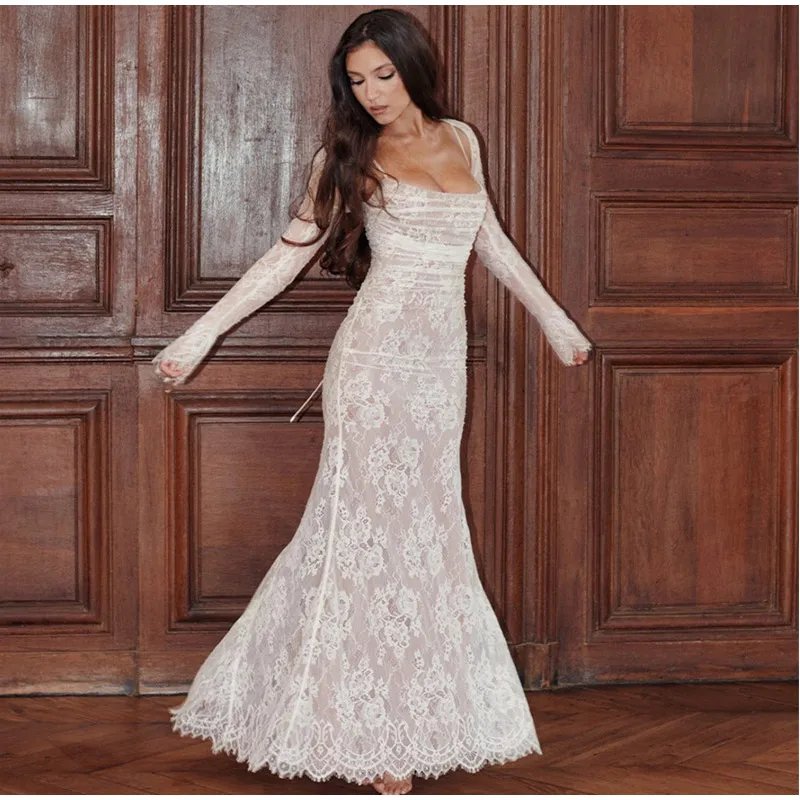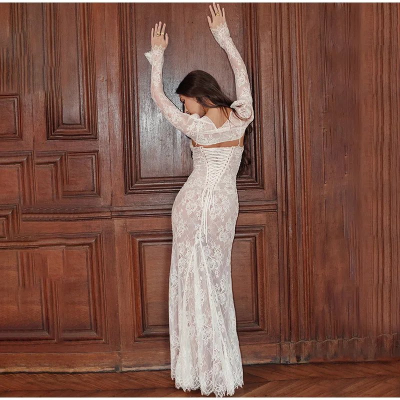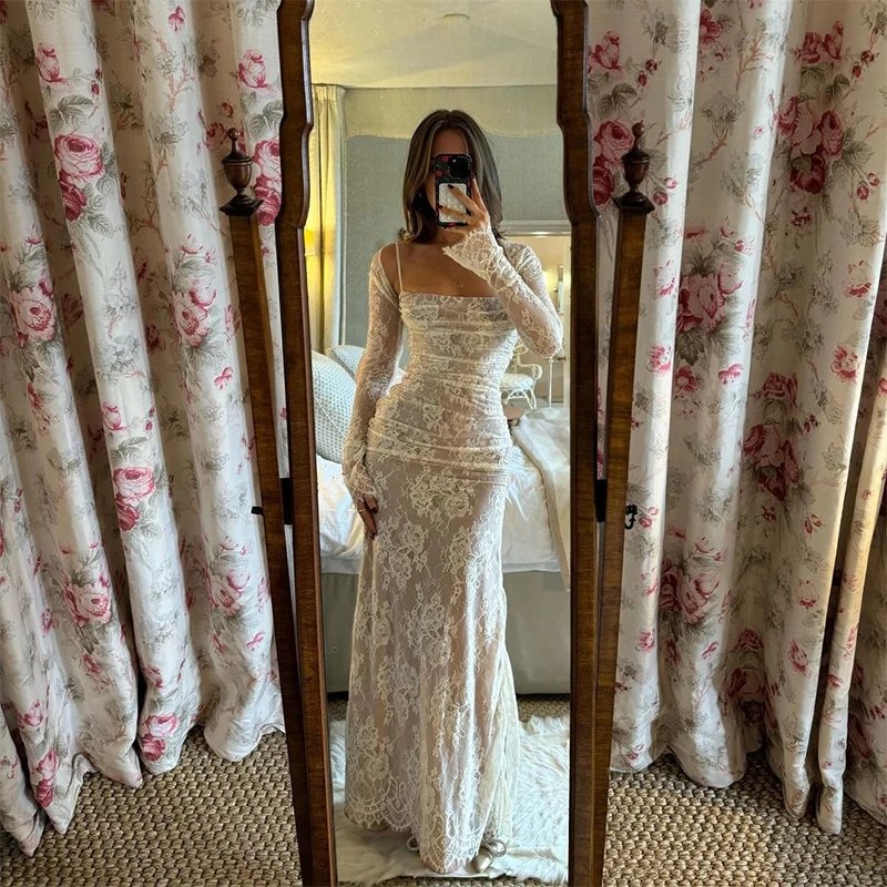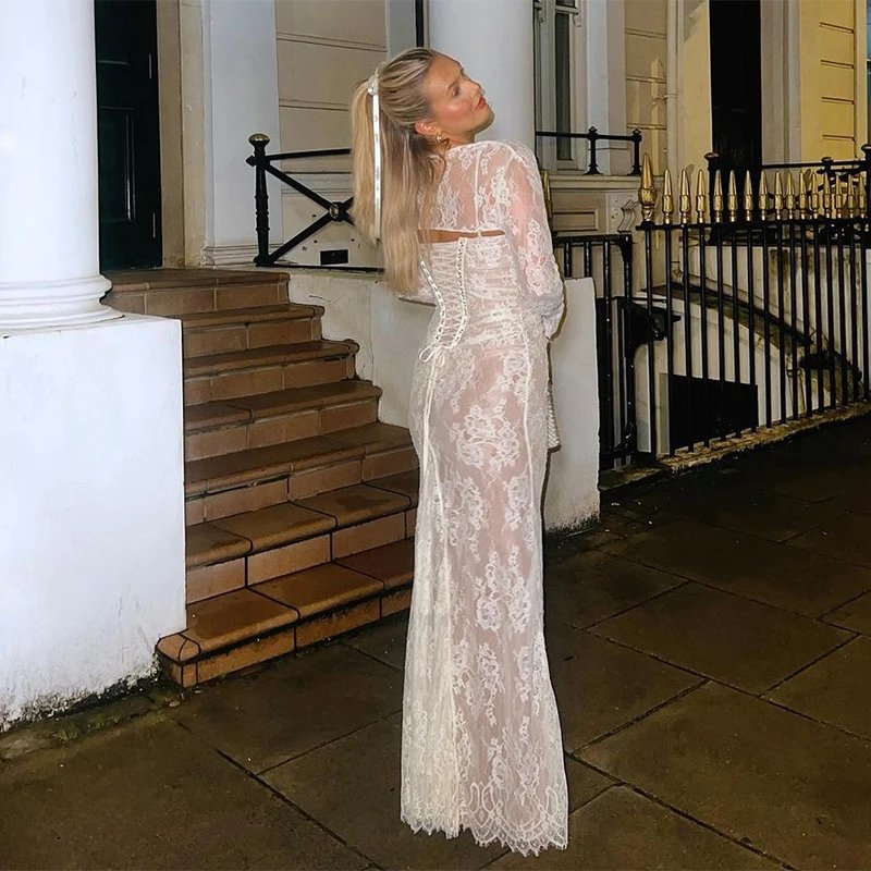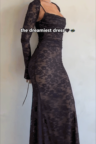Crafted with meticulous attention to detail, the dress features a delicate lace overlay that exudes grace and femininity. The intricate floral patterns cascade gracefully, creating an ethereal aesthetic that captivates with every movement. The maxi length adds a touch of drama, ensuring you make a statement wherever the evening takes you.