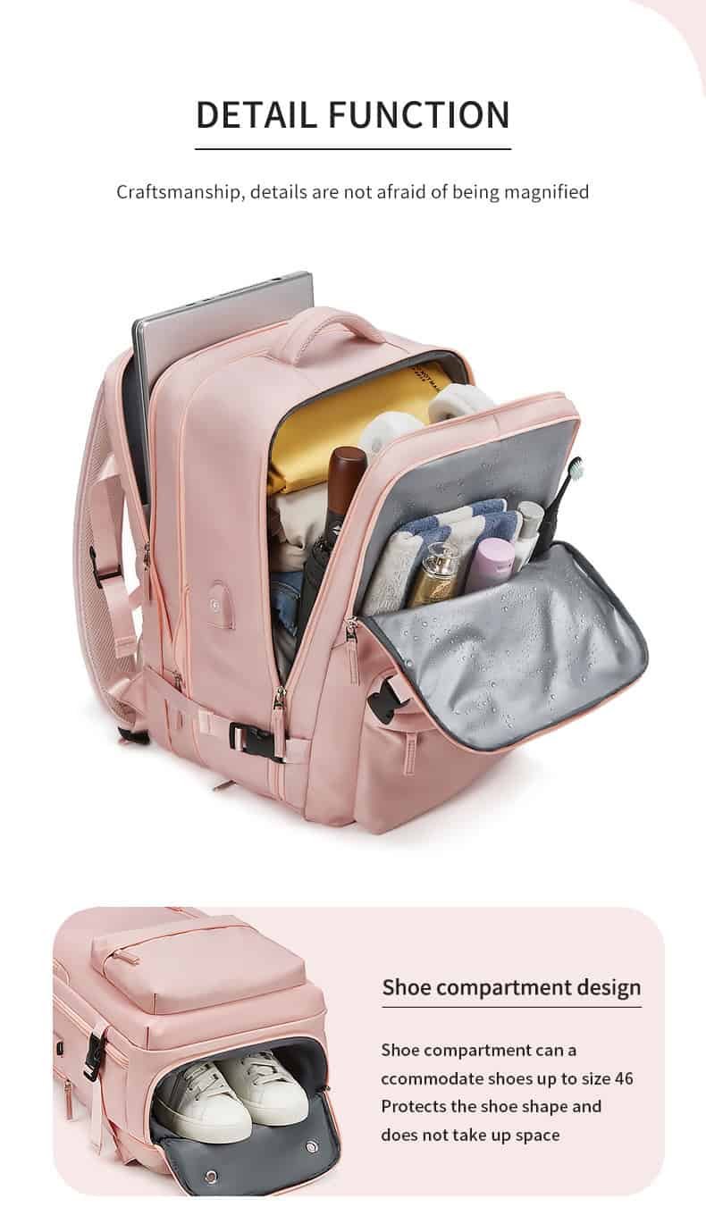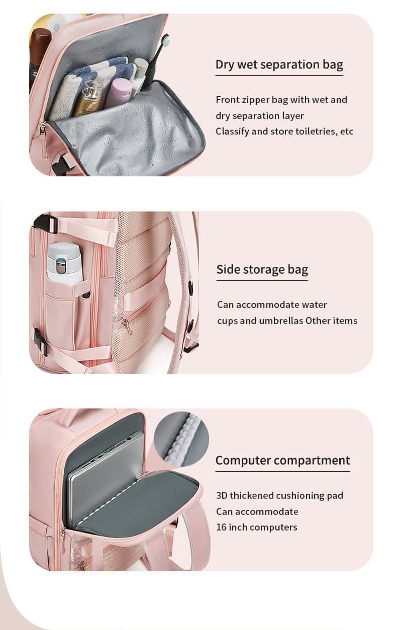 Separate compartment design for shoes and wet bag: 2 main pockets, 2 laptop compartments (suitable for 13-inch tablet and 14-inch laptop respectively), the wet bag is made of high-density waterproof material that can help you to separate dry items and wet items, if you have wet clothes or towel, you can put them in the wet bag. A separate shoe compartment can help you carry and keep your best shoes in your travel bag.