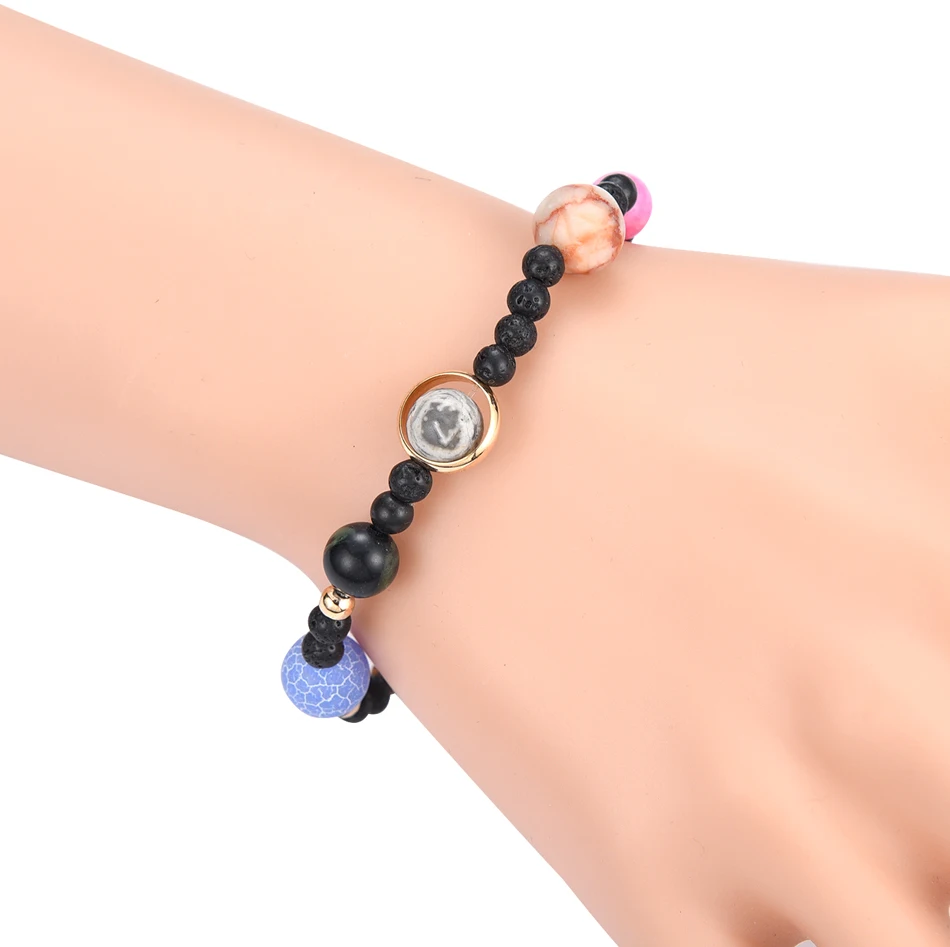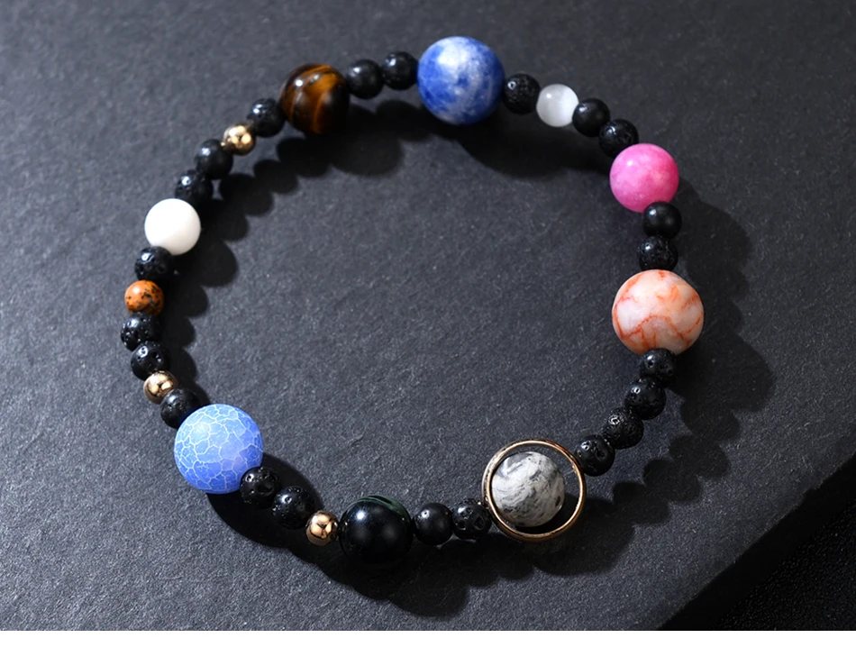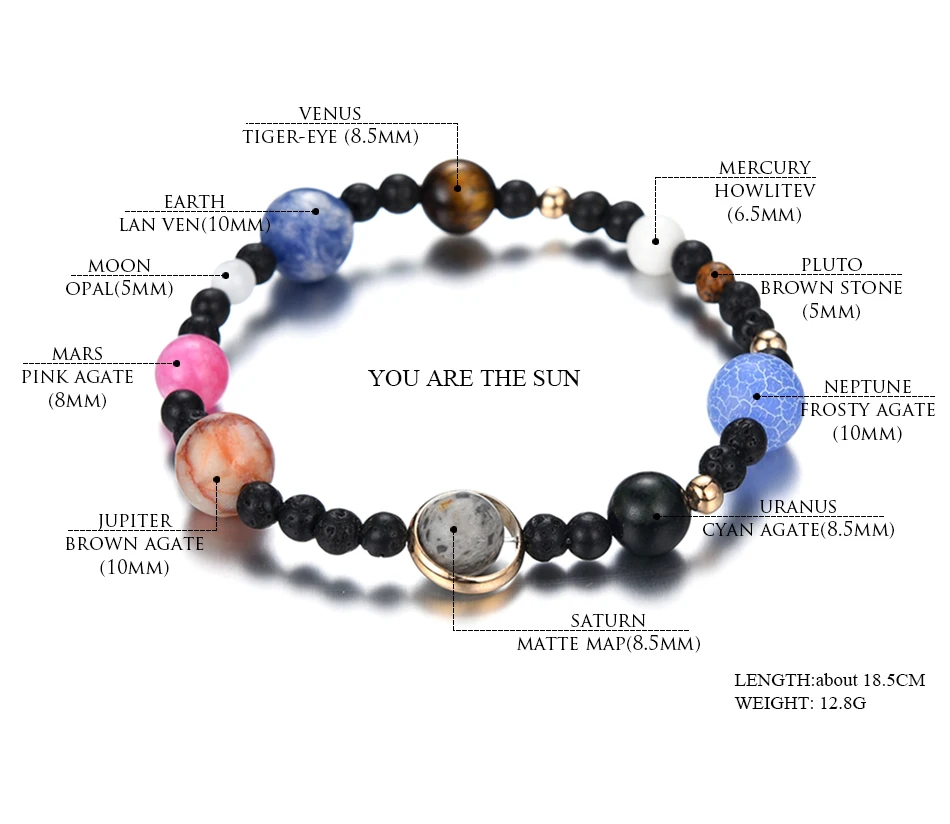 Embody the largest star, and be the center of the galaxy with our dazzling Galaxy Bracelet featuring all 9 planets (including Pluto – we would never leave you out, Pluto). Our Galaxy Bracelet makes the perfect unique gift for that someone special – but get yours quick, the stock is limited. Mars: Pink Agate Moon: Moonstone Earth: La Ven Agate Venus: Tiger’s Eye Mercury: Howlite Pluto: Brownstone Neptune: Frosty Agate Uranus: Cyan Agate Saturn: Matte Map Jupiter: Brown Agate