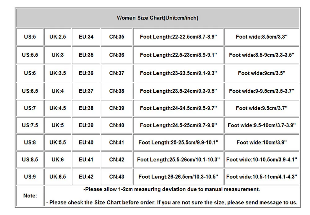 | US:5.5 | UK:3 | EU:35 | CN:36 | Foot Length:22.5-23cm/8.9-9.1″ | Foot wide:8.5-9cm/3.3-3.5″ |