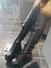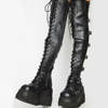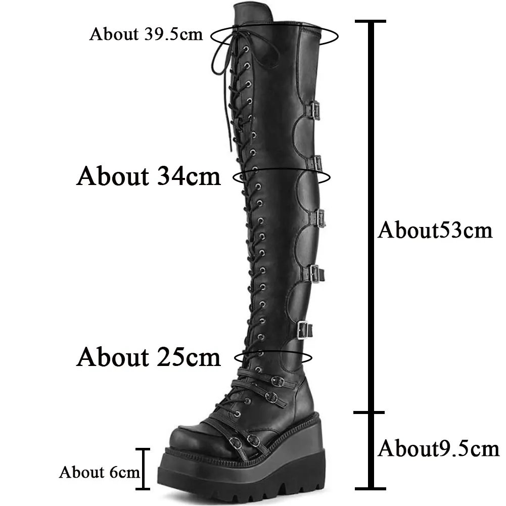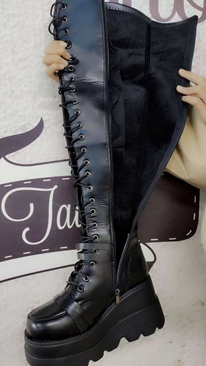 Would you like to try a rebellious style once in your life? Surprise everyone with our high platform boots. The product is made of pure black leather, up to your knees, with front laces and side zip locks. Don’t worry when seeing too many laces; you just need to pull the zip next to it, and you can easily wear or remove the shoes. At the same time, these boots also have a base that is nearly 10 cm high; it will help you significantly cheat height. High-quality leather ensures that you will not get uncomfortable or squashed when wearing shoes for a long time. Let yourself be special in everyone’s eyes. Buy it now!