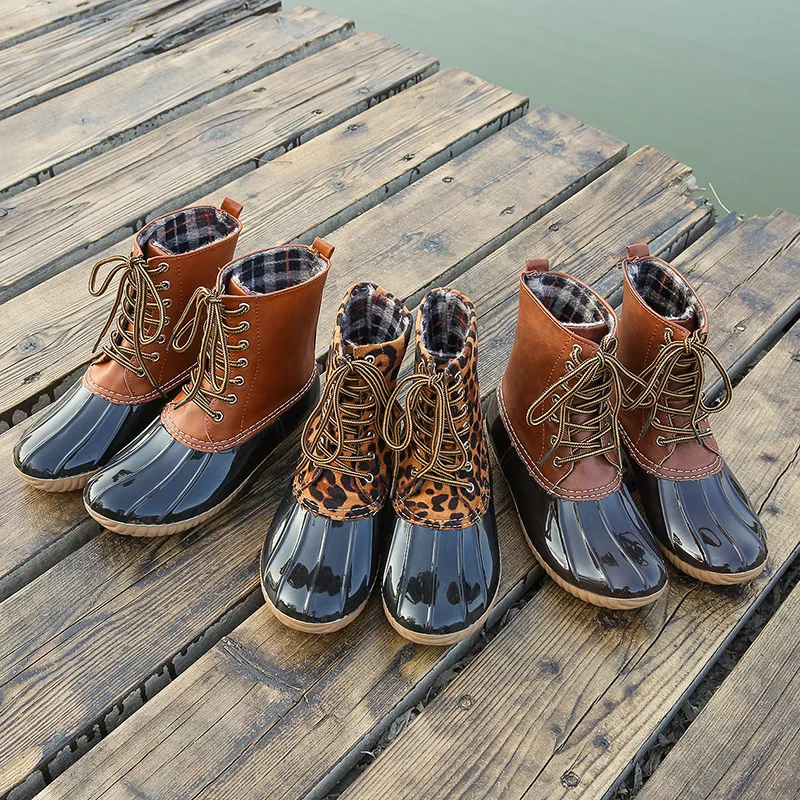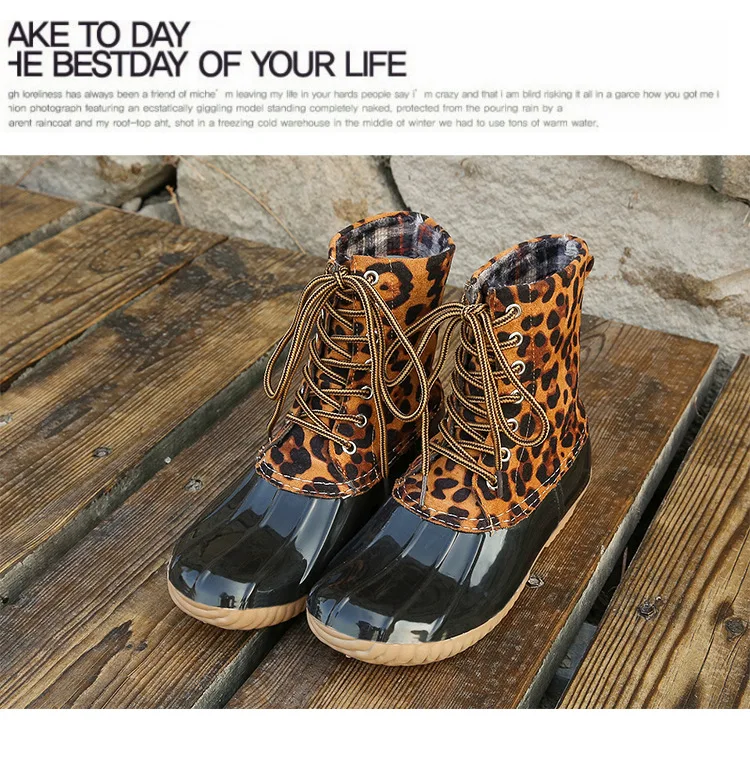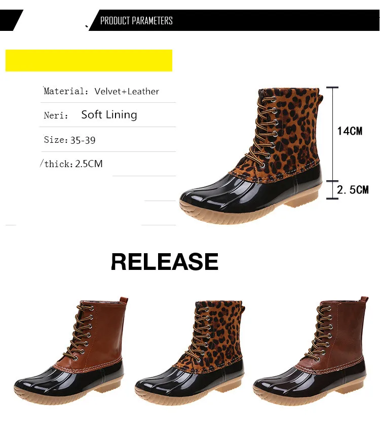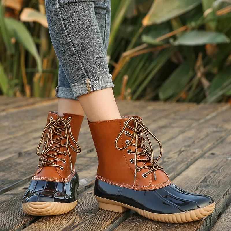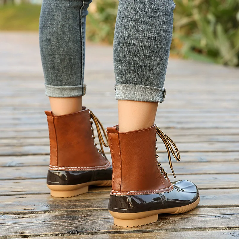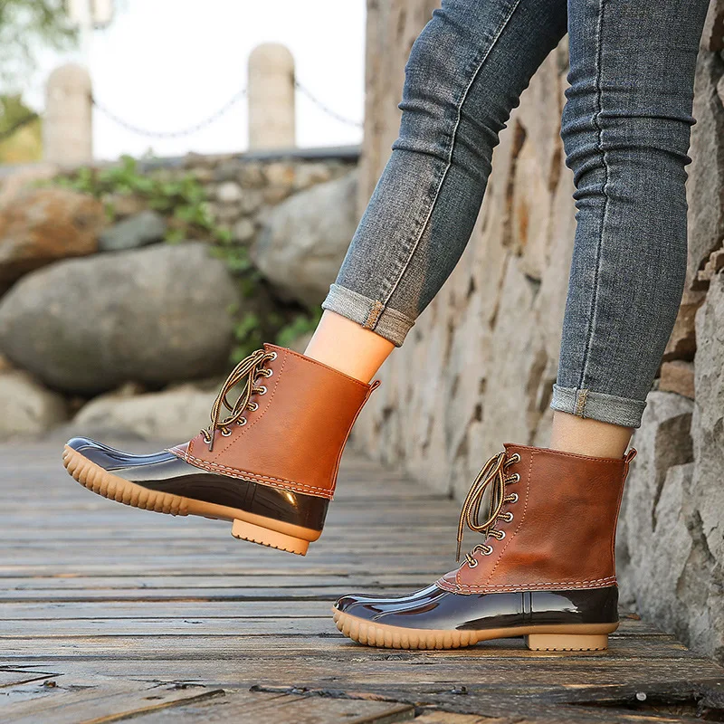 Non-slip, waterproof, durable, keep warm. Lace Up Duck Boots not harmful to humans. And Colors are rich in style for you to choose from. so can be paired easily with any wardrobe styles, perfectly for jeans and skirts