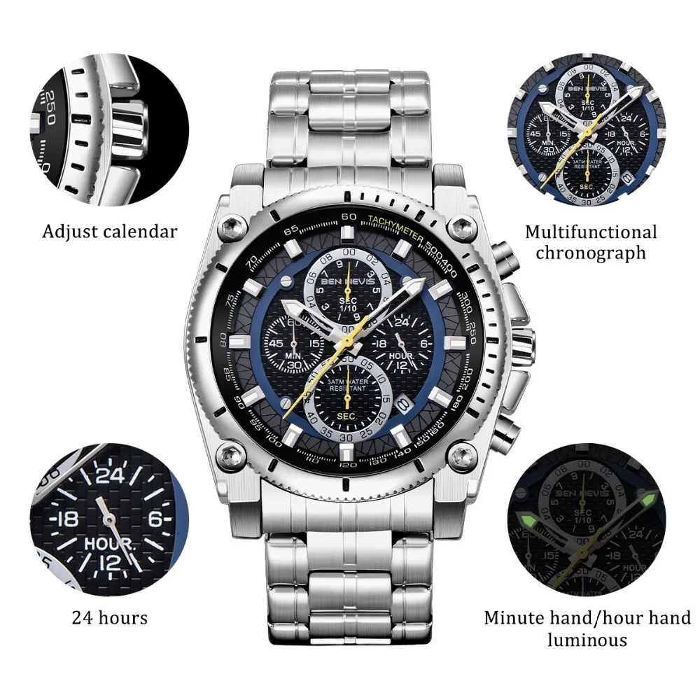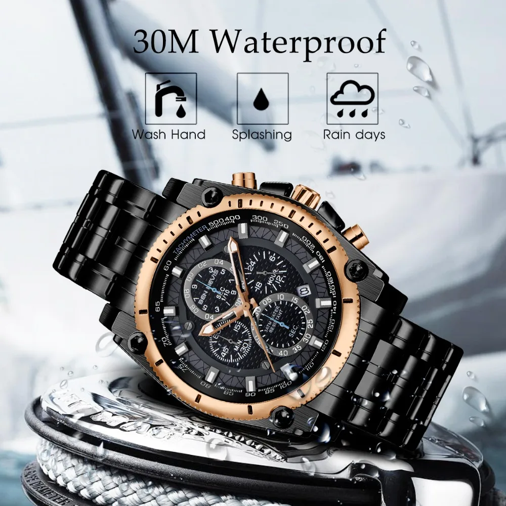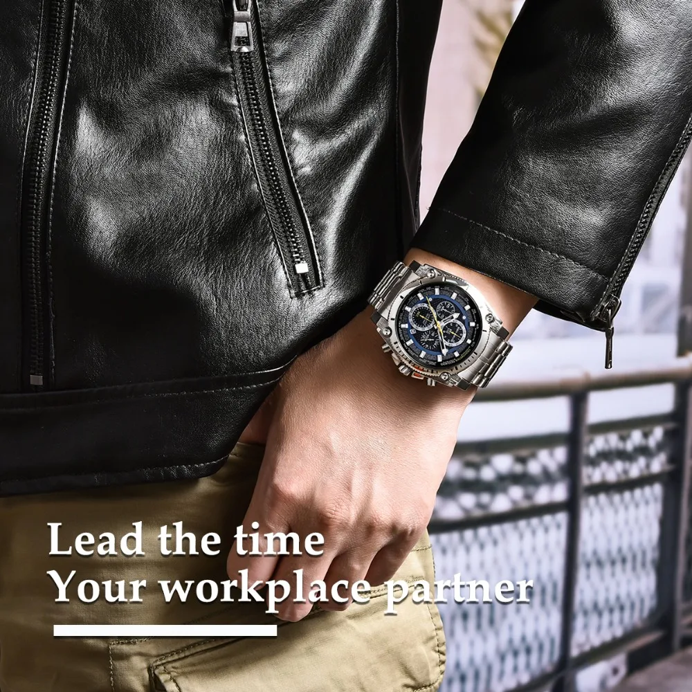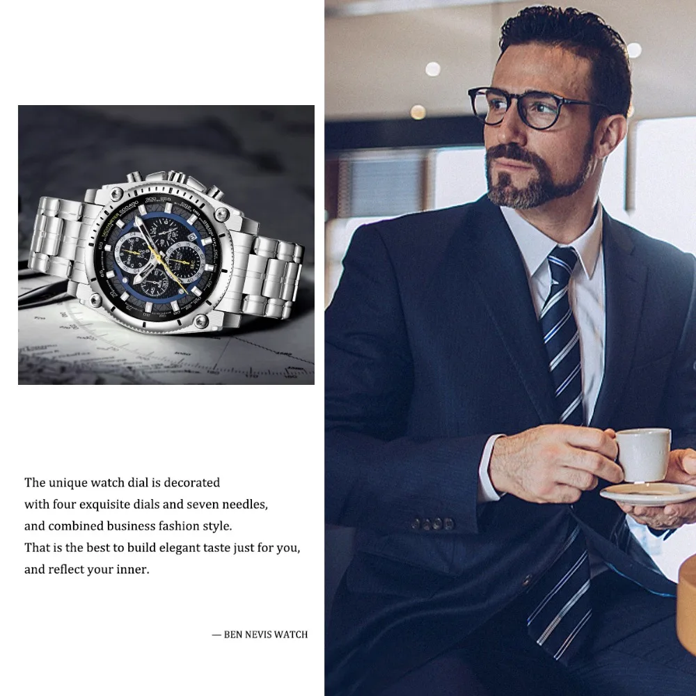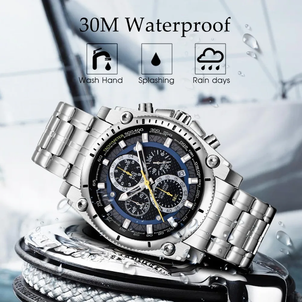 Accessories are important items that create a man’s elegance and prominence, especially the watch. This Men’s stainless steel watch will make a great gift for you. It’s made of stainless steel with curved crystal, a material that is safe for the skin and is durable over time. The unique watch dial is decorated with four exquisite dials and seven needles, also Japanese quartz is glazed on the dial, which is the best to build elegant taste just for you, and reflect your inner. Moreover, with a water resistance of up to 900 feet, you can comfortably wear it for swimming or diving at moderate depths. Make yourself a gentleman with this watch. Buy it now!