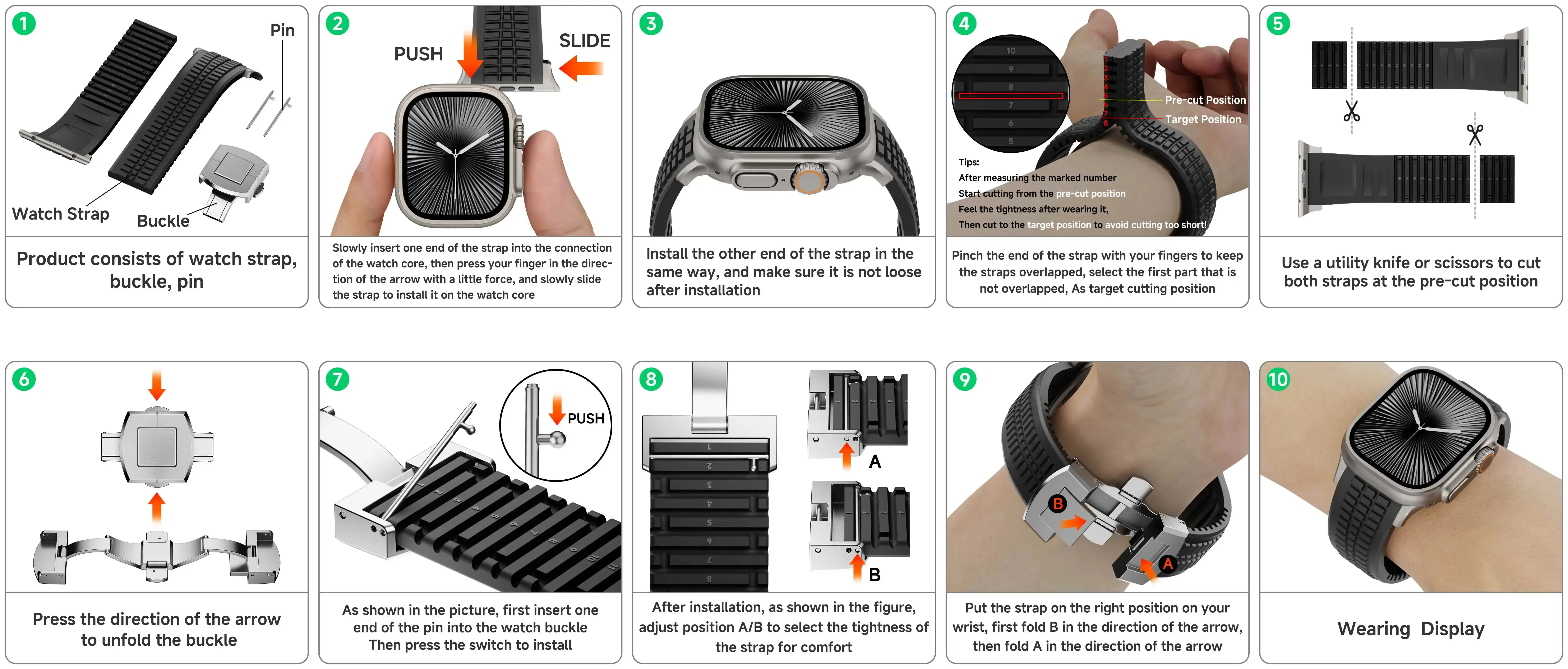 Crafted from high-tensile silicone for ultimate flexibility and strength, this band is built to keep up with your active lifestyle. The reinforced 316L stainless steel folding clasp ensures a secure fit, while the adjustable, cut-to-fit design guarantees a personalized, comfortable feel for wrists ranging from 140 to 230 mm.
