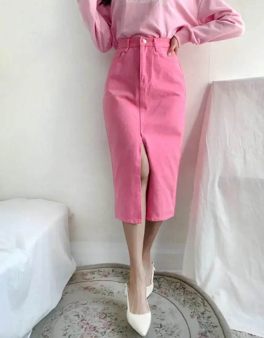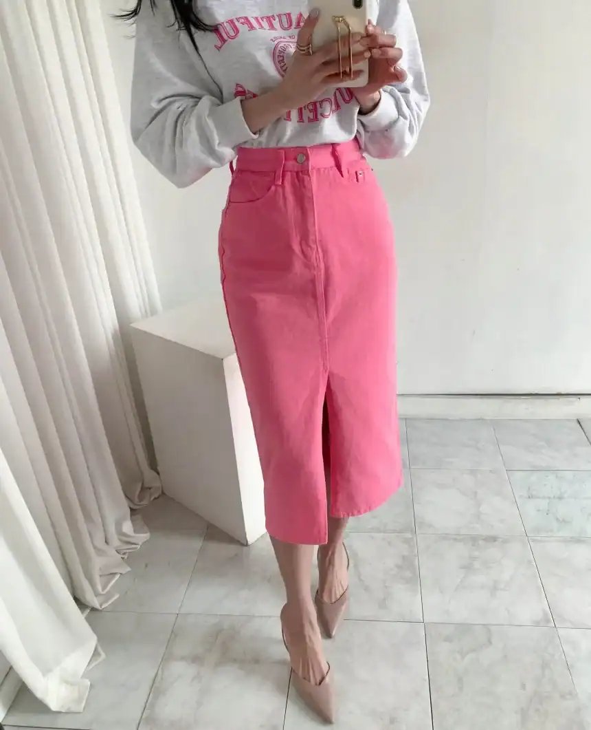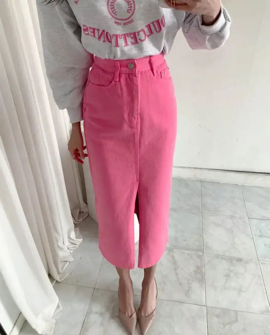 The soft pink shade adds a sweet, romantic touch to your outfit, making it a standout piece in your wardrobe. Unlike traditional blue denim, this skirt offers a fresh, youthful vibe that’s perfect for spring, summer, or even layered looks in fall.