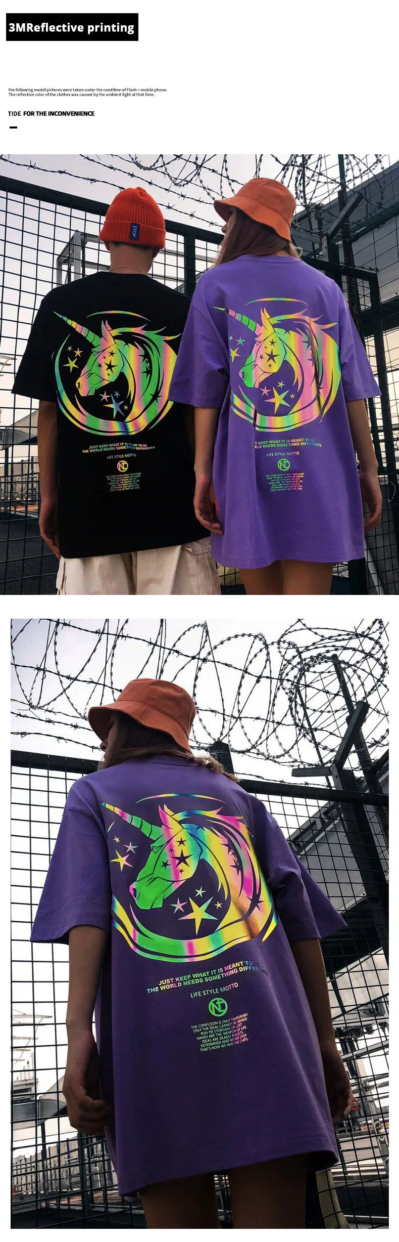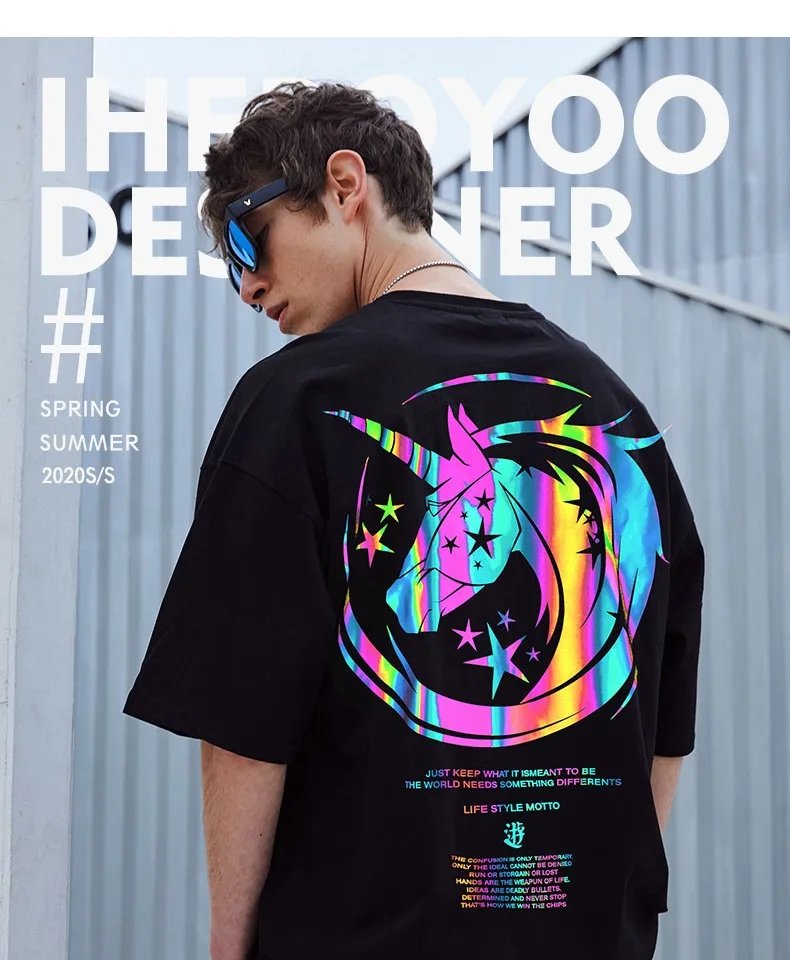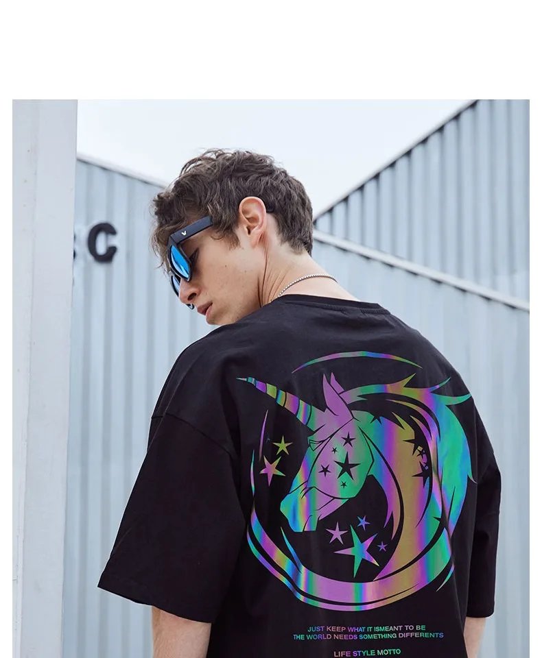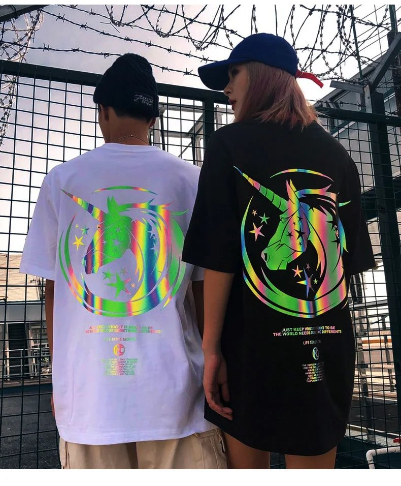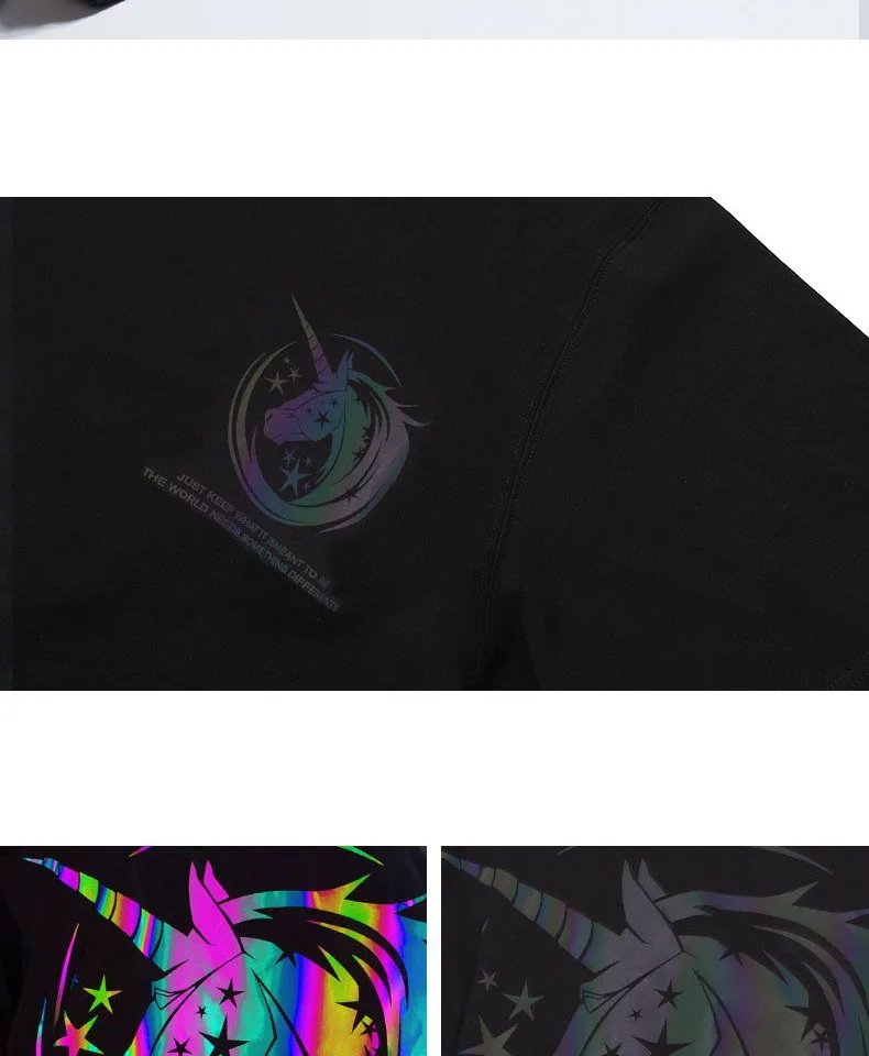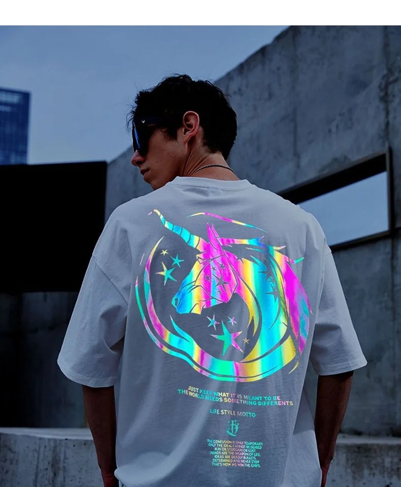 Are you want to own a special T-shirt that has never been to before? Then from now Reflective Unicorn T Shirt will become a staple t-shirt of your wardrobe. The unicorn image will glow in the dark to help you become the focus of night parties. The T-shirt has a round neckline design, makes sense comfortable to wear. With 100% cotton material, the shirt isn’t wrinkled, no shrinkage after washing, no fading. The unicorn logo has different effects when shooting at different angles. The shirt is extremely soft and comfortable. You will love the way this shirt looks and feels. Grab it now!