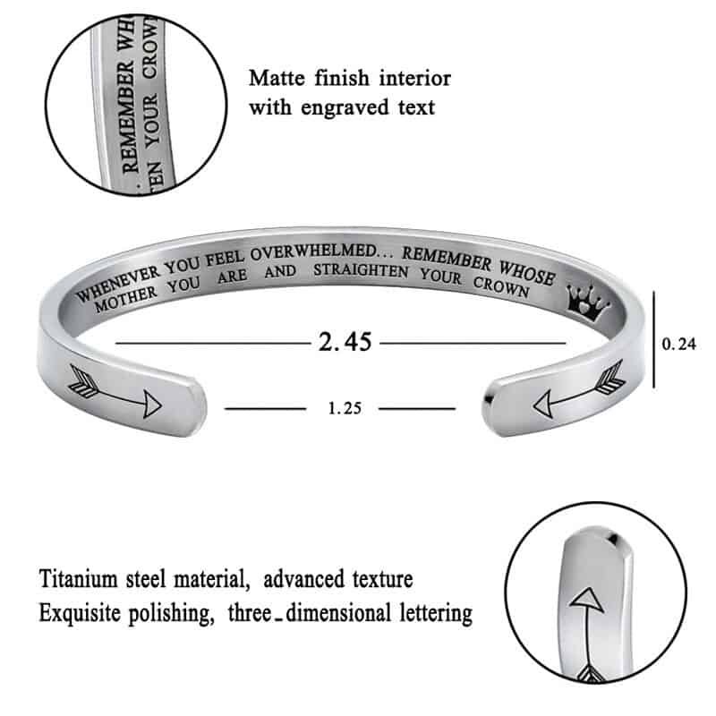 Are you looking for a special bracelet for your daughter? Let’s try our Stainless steel cuff bracelet, a wonderful gift! This cuff bracelet will be with her side by side, wherever she goes so she can feel that you are always there for her. It is durable and practical but also is able to convey the meaning of your love. The Stainless steel crown bracelet is a quality piece of jewelry with simple arrows visible on the outside, but a hidden message on the inside. “Whenever you feel overwhelmed, remember whose daughter you are and straighten your crown”. Don’t skip it! Buy now!