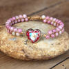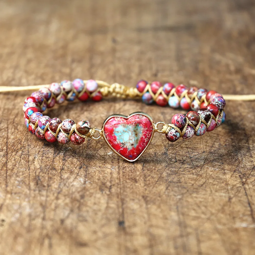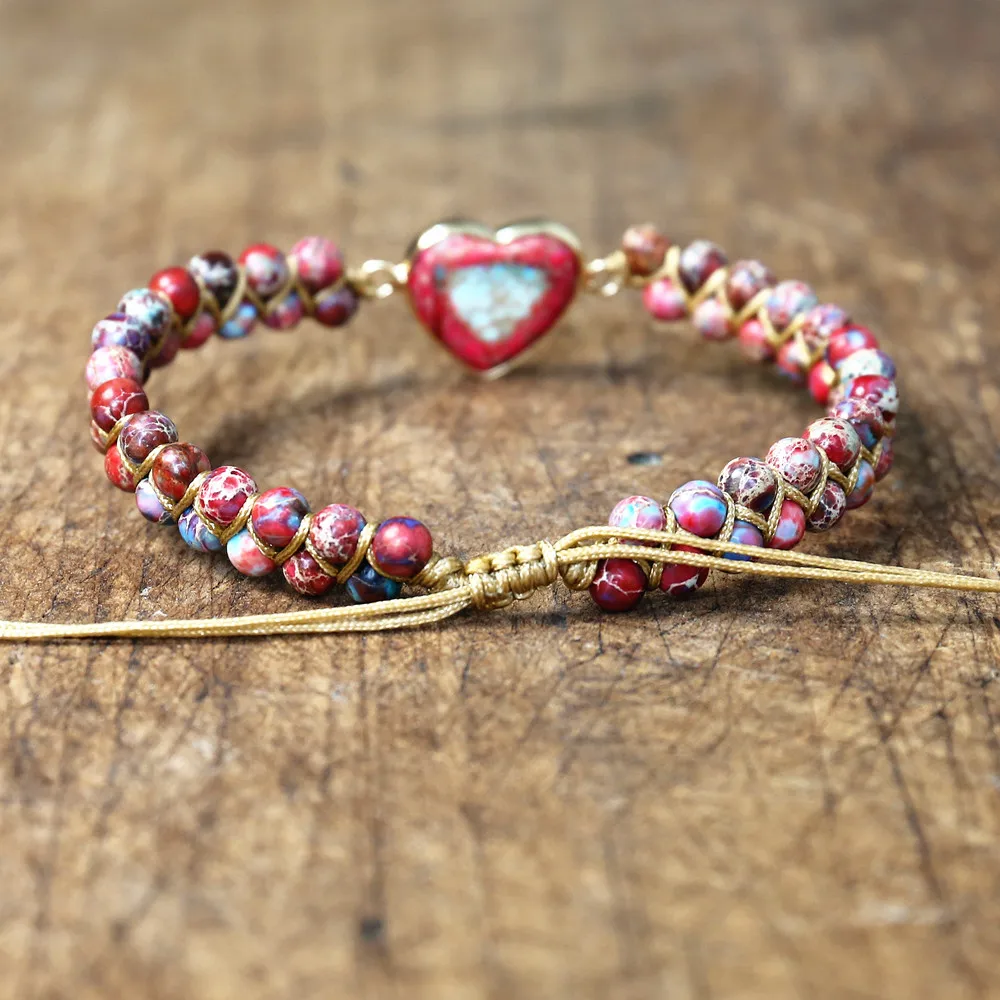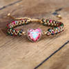 The beautiful Handmade Stone Heart Charm Bracelet is a great way to show your spiritual waking and individuality. Due to the fact that the bracelets are handmade, each bracelet may be slightly different from each other, meaning that the coloring of the beads may be slightly different between the beads. Your bracelet will be one of a kind, just like you. This bracelet has an adjustable design. Hand woven rope with sliding flat knot closure and drawstring for adjustment.