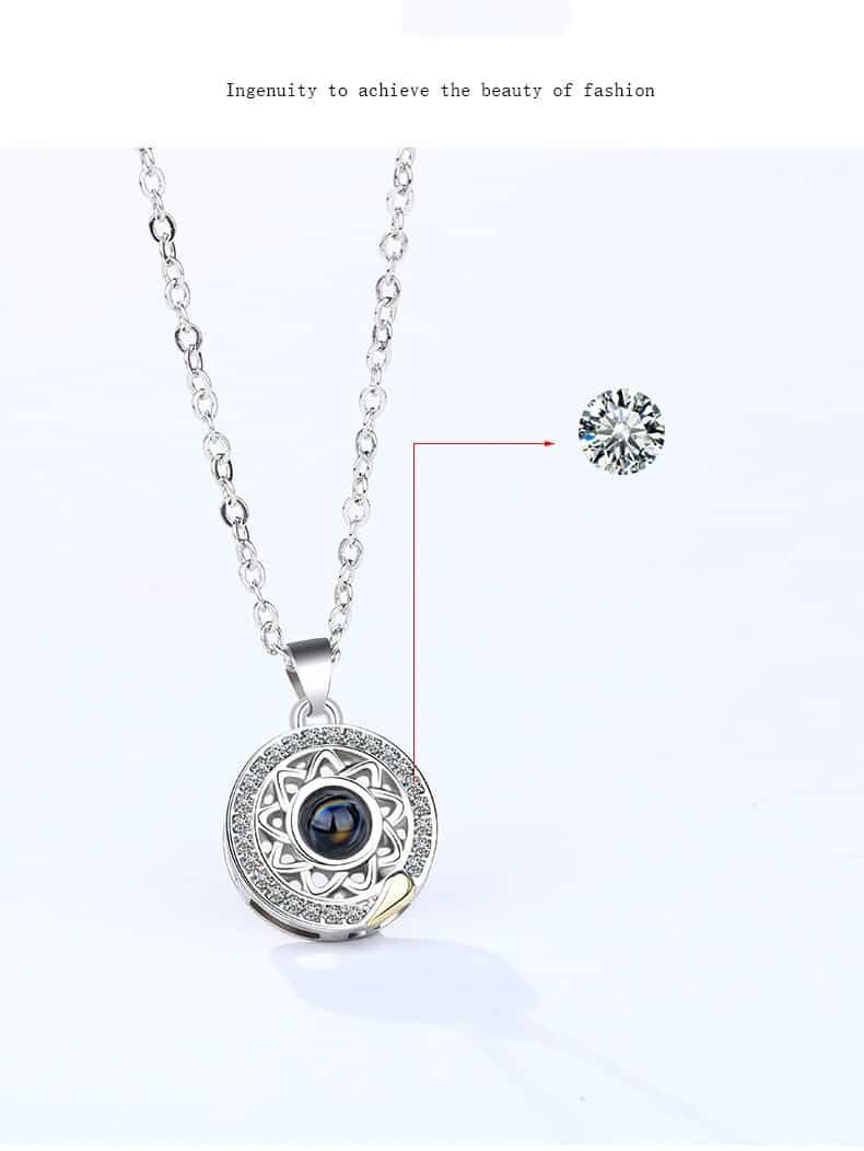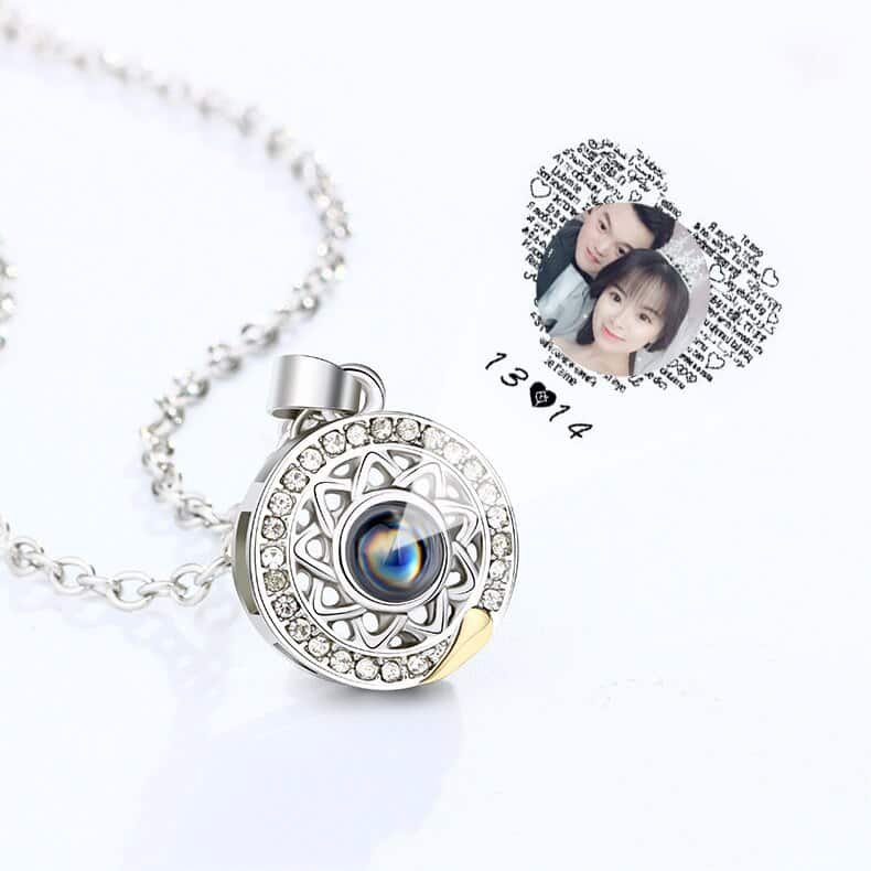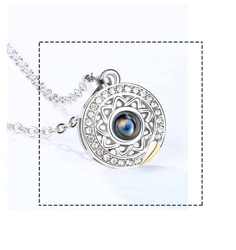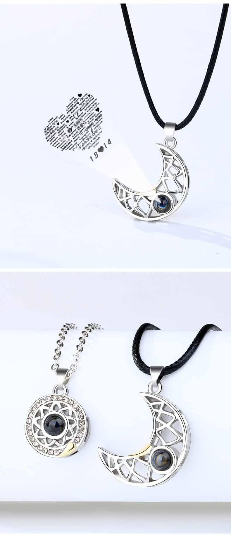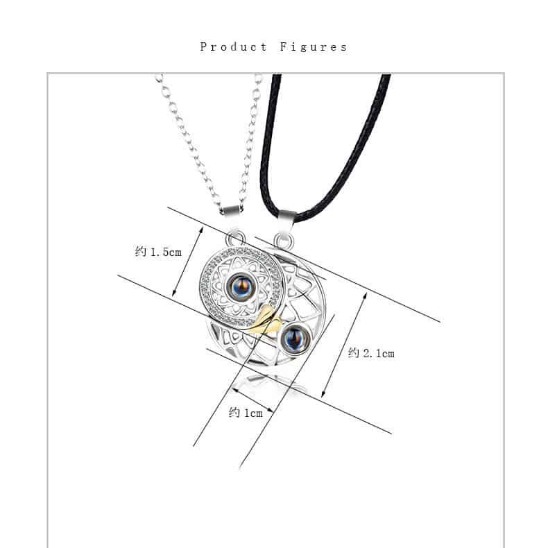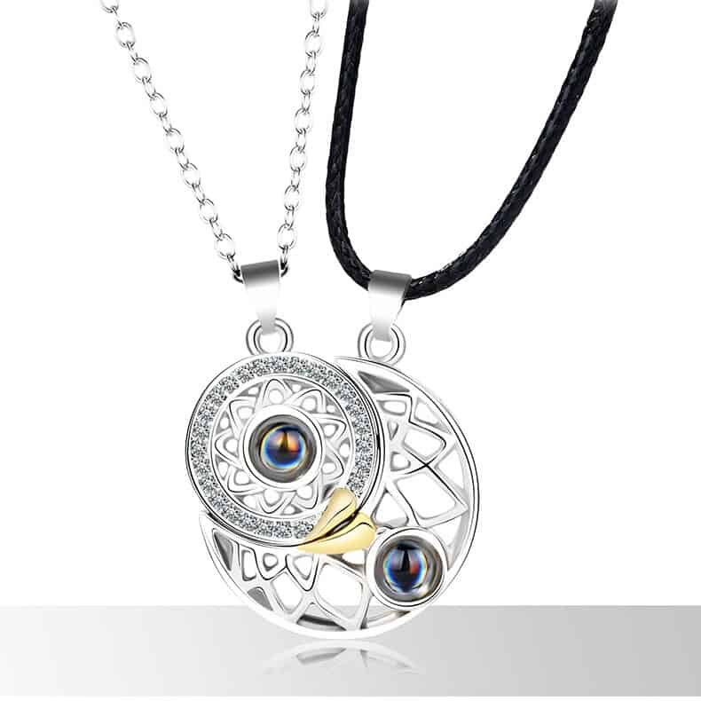 Do you want to find a special gift on the anniversary of love? If that, don’t ignore our Sun and Moon couple necklace. The product is made of stainless steel, hypoallergenic, nickel-free, lead-free, safe to wear in your daily life. There is a magnet design inside the sun and moon pendants, once they are placed closely, they will connect to each other and attach to one another. Moreover, this necklace engraves “I Love You” in 100 different languages into the stone, when you shine a light through it and project it on a wall, you will see the 100 languages of “I love you”. This is a perfect gift that represents the intimate relationship between you and the one you love. Buy it now!
