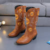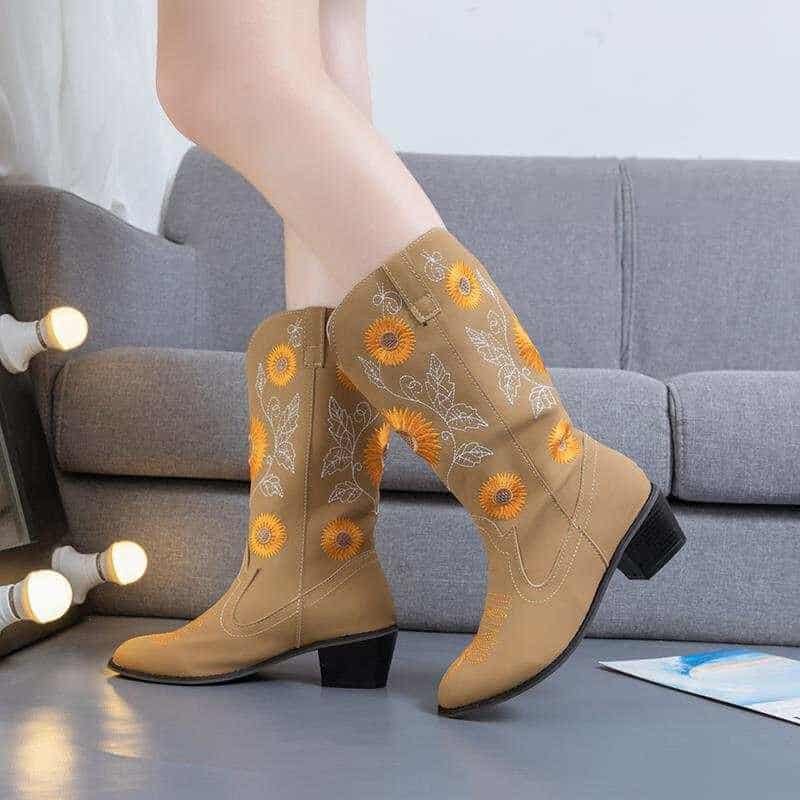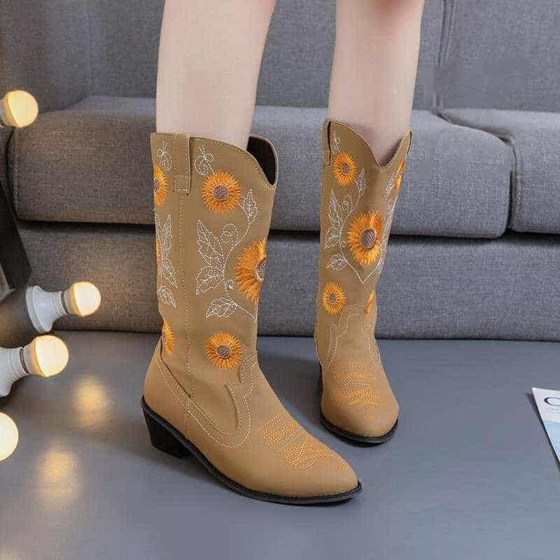Are you looking for special boots for this winter? Introduce to you our Sunflower boots, these cowgirl boots make you smile, these cowgirl boots will make you smile. This is a classic cut toe cowboy boots, perfect for you to have fun in the countryside, date night, or country wedding. It has a gorgeous Girasol embroidery design, buttery soft blue-green pig-eye lining, and traditional leather insoles. Just like a sunflower, you will definitely stand out from the crowd. The flexibility of the sole helps to support your weight and gives really good feedback to your body which can protect against knee joint injury effectively. Beauty and function combined into the perfect all-purpose winter boot. Don’t skip it! Buy now!