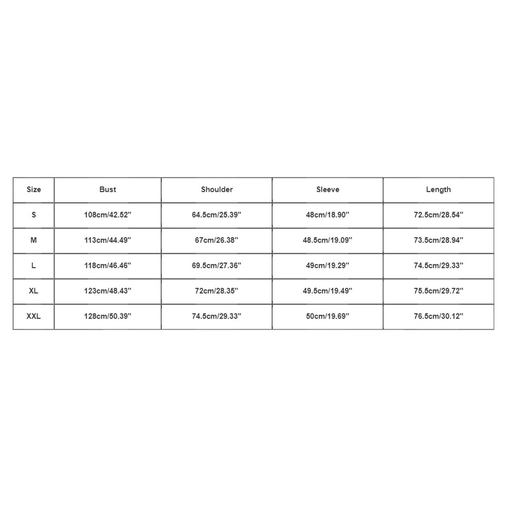 | Size:XXL | Bust:128cm/50.39” | Shoulder:74.5cm/29.33” | Sleeve:50cm/19.69” | Length:76.5cm/30.12” |