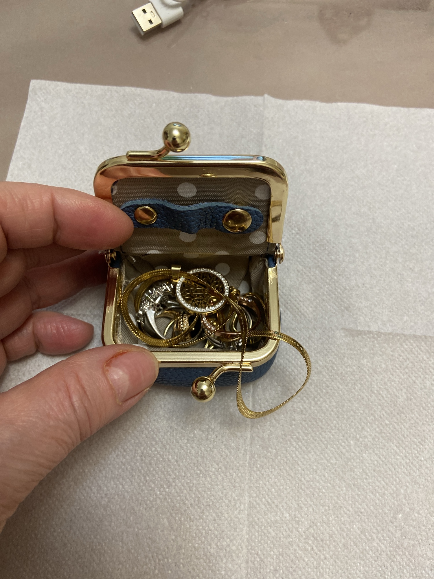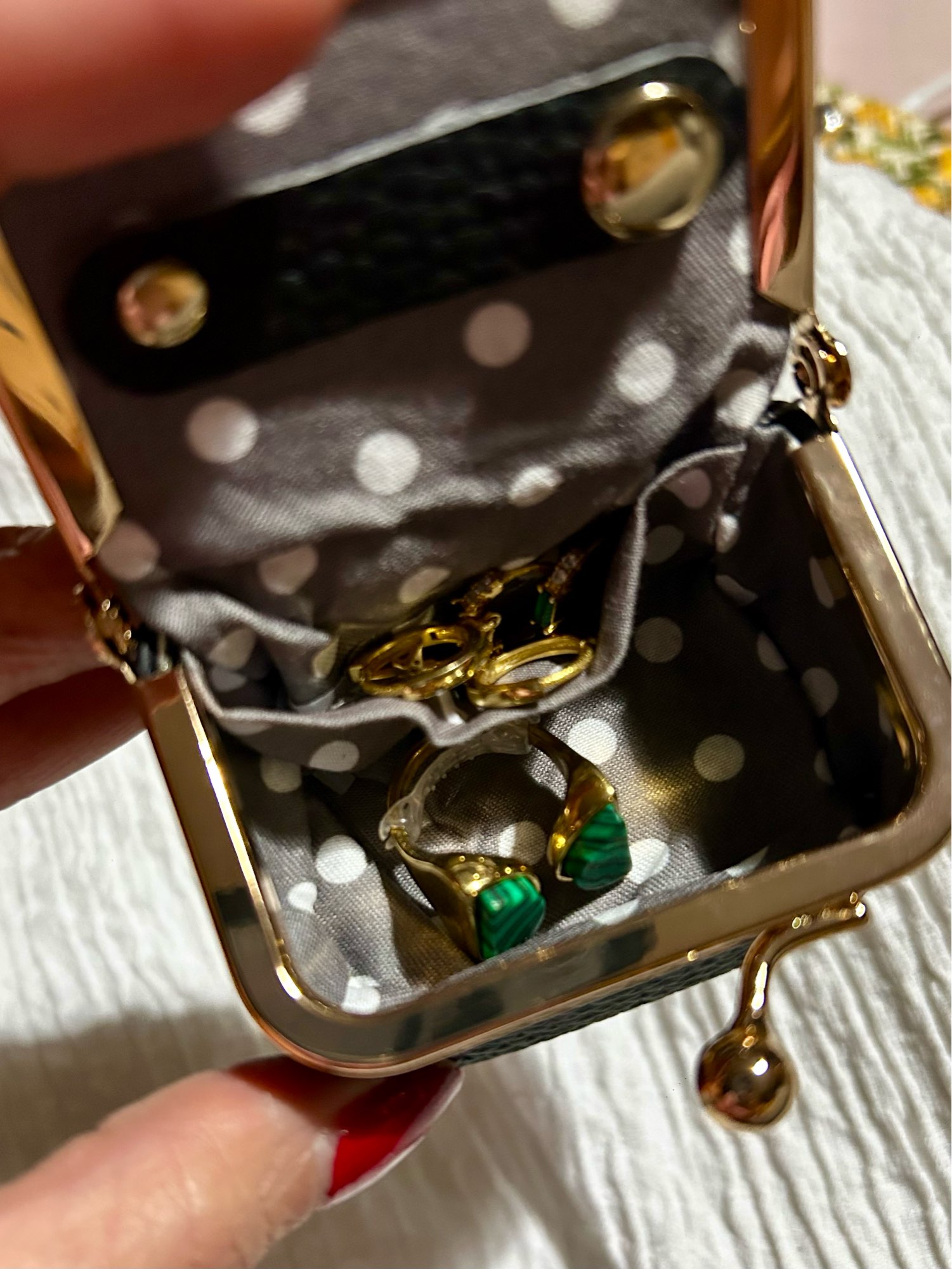 Open it up to reveal a soft, polka‑dot interior lining that cushions your jewelry and prevents scratches. Thoughtfully divided compartments keep rings, studs, small hoops, and delicate pieces neatly separated, so you’ll never deal with tangled accessories again. Its secure snap closure ensures your valuables stay safely in place, no matter where the day takes you.