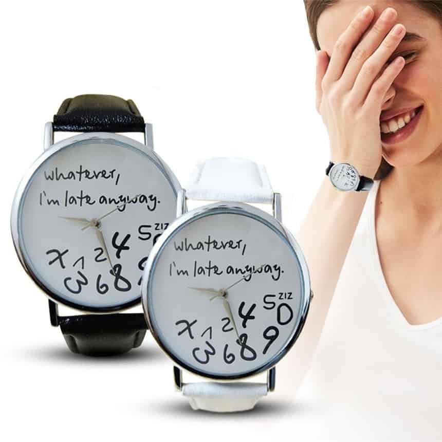 Looking for a watch that’s simple but still makes a splash? We would like to introduce you to this Whatever I’m Late Anyway Watch. A special feature of this watch is that the dial has no hours at all. The watch case is made of metal, soft leather watchband, a metal buckle closure allows you to adjust the watchband to fit your wrist and for different sizes of wrists. The premium quartz movement for accurate and constant timekeeping, long-time life battery. It is a great gift choice for your beloved someone, ideal for men, women, business, or casual. Get it now!
