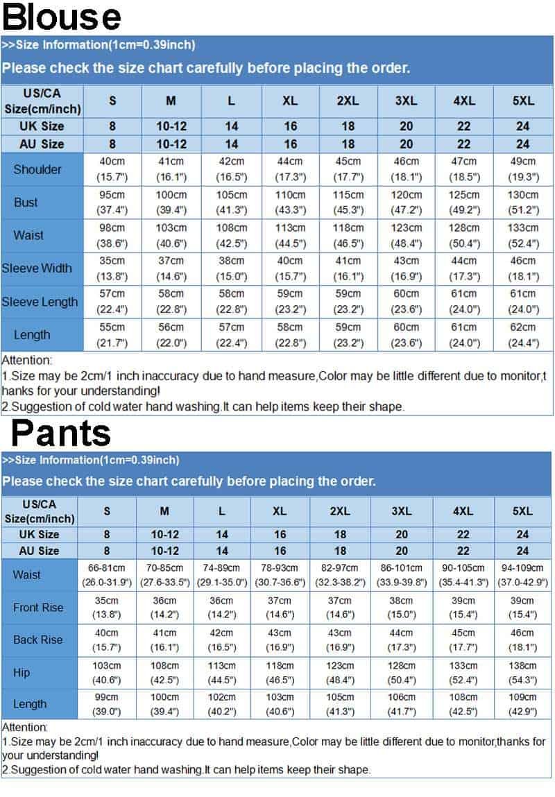 Package included:1 Suit(Blouse + Pants)
