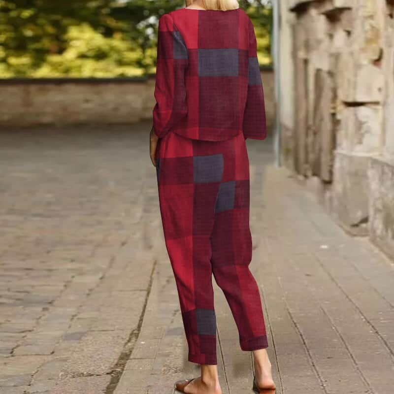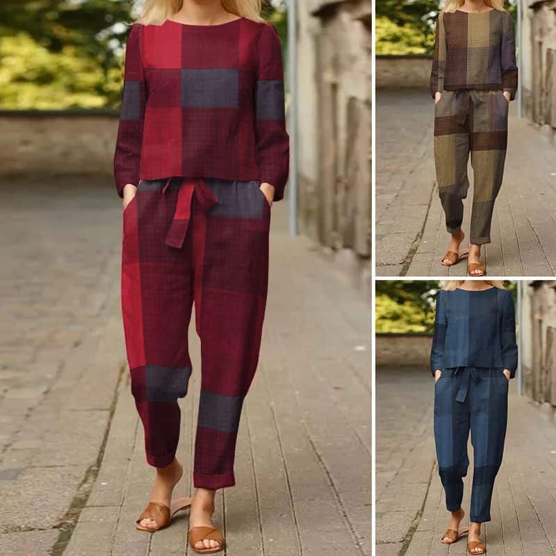 Are you looking for a comfortable outfit to wear at home? Don’t ignore our Long sleeve woman grid suit. The product is made of 35% cotton and 65% rayon, soft, air permeable, and absorbent. This set includes a round neck long-sleeve top and long pants, you can comfortably wear it in spring, autumn, and early winter. It has a design to be generously oversized, brings absolute comfort to your skin, and helps you relax while active at home. The simple textures and deep colors, although not too prominent, still have their own beauty for those who like the classic. It can be a meaningful gift for your mother, wife, girlfriend, or another woman you love. Buy right now!